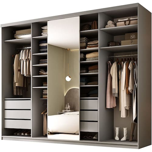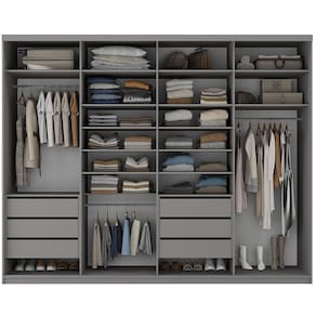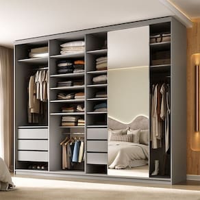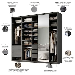 A grandiosidade de um walk-in closet em um móvel pronto. Para quem demanda máximo espaço e impacto visual, o Closet Casal Sonni 277cm é a declaração definitiva. Sua extensão generosa oferece uma organização completa e categorizada para todo o guarda roupa do casal. O grande espelho na porta de correr cria um efeito espetacular de amplitude e luz, ao passo que cada detalhe, das corrediças telescópicas ao acabamento impecável, fala de qualidade superior. Eleve seu quarto de casal ao patamar do luxo organizado e funcional. Confira as especificações técnicas e surpreenda-se!