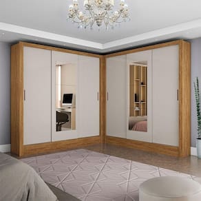 Closet Casal Duplo Dubai 6 Portas Com Espelho 6 Gavetas Cinamomo Com Off White O Closet Casal Duplo Dubai e uma excelente solucao para quem busca praticidade, elegancia e organizacao no quarto. Com 6 portas deslizantes, 6 gavetas com corredicas metalicas, 6 espelhos, 12 prateleiras internas e 2 cabideiros em aluminio, o movel oferece um espaco funcional e versatil para armazenar roupas, acessorios, calcados e muito mais. As roldanas em aco e o trilho em aluminio garantem suavidade no deslizamento das portas. O cabideiro de 1,11m e ideal para pendurar camisas, blusas, vestidos e acessorios. As gavetas amplas sao perfeitas para guardar pijamas, roupas intimas, meias e pecas do dia a dia. As prateleiras possibilitam a organizacao de roupas de cama e banho, kits de higiene, perfumes e itens diversos. A parte inferior do closet pode ser usada como sapateira, ideal para acomodar desde malas ate colecoes de calcados. O produto e fabricado em MDP de alta resistencia e pode ser montado em L, linear ou em paredes distintas, adaptando-se ao seu ambiente. Destaques do produto Closet casal funcional com design moderno 6 portas deslizantes com roldanas em aco Trilhos em aluminio de alta qualidade 6 espelhos aplicados nas portas 12 prateleiras espacosas para organizacao 6 gavetas com corredicas metalicas 2 cabideiros de aluminio com 1,11m de comprimento Estrutura em MDP duravel Montagem versatil: linear, em L ou em paredes separadas