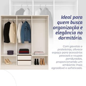 Produzido em MDP de 12 mm, o closet oferece resistência e durabilidade. Conta com 2 gavetas com corrediças metálicas, 2 prateleiras espaçosas e 3 cabideiros, permitindo uma organização eficiente de roupas, calçados e itens pessoais. O acabamento fosco confere um toque sofisticado ao móvel.