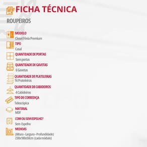 Caracteristicas: Material da Estrutura: 100MDF Tipo de Acabamento: Pintura UV Material das Corredicas: Telescopica Material dos Cabideiros: Aluminio Este modelo nao contem portas