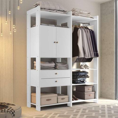 - Diversas prateleiras com espaço para roupas, sapatos, roupas de cama, malas, e objetos pessoais