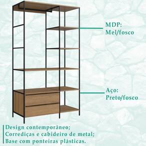 Closet Roupeiro Industrial 02 Gvt 180 Cm P1025, possui design em alta e espaço de sobra para você armazenar suas peças de roupa com estilo. Possui estrutura em aço e MDP de 15 mm, 02 gavetas com frente passante e corrediças metálicas, 06 prateleiras e um cabideiro, sua base conta com ponteiras plásticas, evitando riscos no chão de seu cômodo. Com sua estética atual e sua ilustre versatilidade, ele irá agregar tanto na decoração, quanto na praticidade ao guardar seus itens. Este móvel chegará na sua casa separado em 01 volume.