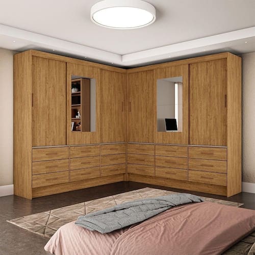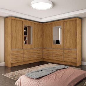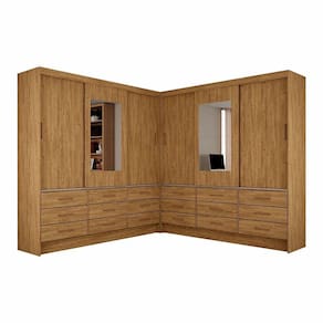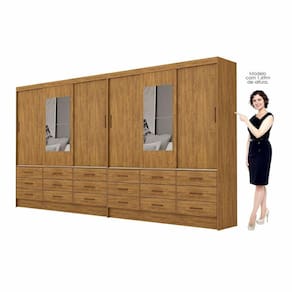 Closet Sevilha 6 Portas Casal Duplo Com Espelho 18 Gavetas Cinamomo Closet Casal Duplo Sevilha 6 Portas, 18 Gavetas e 4 Espelhos com 2,00m de altura, 3,24m de largura e 0,45m de produndidade, com 4 Portas e 12 Gavetas externas com corredicas metalicas. Ideal para otimizar o espaco do ambiente e deixar tudo organizado. Possui pintura UV, que oferece ao produto resistencia e durabilidade. Estrutura em MDP. As dimensoes apresentadas referem-se a um modulo, sendo importante destacar que o O Closet Casal Duplo Sevilha 6 Portas com 18 Gavetas consiste em 2 modulos em um unico produto. Ele pode ser montado em L, de forma linear ou em paredes distintas, adaptando-se perfeitamente ao seu espaco. Caracteristicas gerais: 6 portas 18 gavetas 4 espelhos Pintura UV Estrutura em MDP