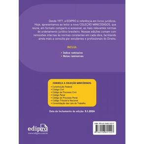Desde 1977, a EDIPRO é referência em livros jurídicos. Hoje, apresentamos ao leitor a nova COLEÇÃO MINICÓDIGOS, que reúne, em formato compacto e acessível, as mais relevantes normas do ordenamento jurídico brasileiro. Nossas edições contam com remissões internas às normas constantes em cada obra, facilitando ainda mais a consulta por estudantes e profissionais do Direito. INCLUI: Índice remissivo Notas remissivas CONHEÇA A COLEÇÃO MINICÓDIGOS: Constituição Federal; Código Civil; Código de Processo Civil; Código Penal; Código de Processo Penal; Código Tributário Nacional; Consolidação das Leis do Trabalho; Ean: 9786556601427