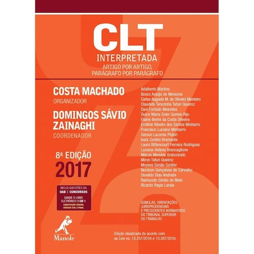 Obra didática, completa e fácil de manusear. Didática porque, sendo seus autores professores de Direito do Trabalho e/ou Processual do Trabalho, incluindo o coordenador, a preocupação pedagógica é uma constante, o que faz da obra um sucedâneo dos manuais existentes nas livrarias jurídicas. Completa porque corresponde ao único trabalho disponível no mercado que realmente apresenta interpretações artigo por artigo, parágrafo por parágrafo da CLT. Fácil de manusear e transportar, por conta do seu formato reduzido, permite ao aluno levar todos os dias a sua CLT interpretada para a faculdade e ao profissional levá-la para o fórum e suas audiências. Marca: EDITORA MANOLE LTDA