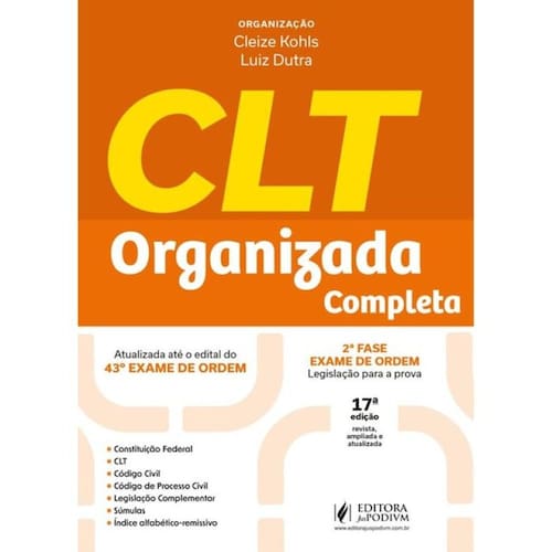 ESTA PODE SER LEVADA PARA A PROVA! Sim! Você poderá levar a CLT Organizada no dia da 2ª Fase do Exame, pois seu conteúdo atende aos requisitos do edital. Além de poder utilizá-la na etapa de estudos, ela também será sua companheira de consulta nas provas! SOB MEDIDA PARA SUA PROVA! A CLT ORGANIZADA tem a melhor seleção de normas que você precisa para a sua aprovação e está atualizada até o edital do 43º Exame de Ordem Unificado – OAB. O LEITOR ENCONTRARÁ: • Constituição Federal • CLT • Código Civil • Código de Processo Civil • Legislação Complementar • Súmulas, OJs e PNs • Índice alfabético-remissivo POR QUE ESCOLHER A CLT ORGANIZADA? A CLT Organizada foi criada especialmente para atender às necessidades dos candidatos ao Exame de Ordem que fizeram a opção pela área Trabalhista na 2ª fase do certame. Foi preparada pelos experientes e renomados Professores Cleize Kohls e Luiz Henrique Menegon Dutra, que fizeram a seleção das normas, elaboraram as remissões e o índice alfabético-remissivo. A CLT traz os principais diplomas legais objeto de questionamento na 2ª Fase do Exame da OAB e conta com diversos facilitadores de consulta como tarjas laterais com as seções do livro, cabeçalho, atualizações destacadas, entre outros. Atualizada até o edital do 43º Exame da OAB, sua utilização é permitida para a 2ª fase da prova. É, portanto, uma importante aliada na pesquisa das fundamentações e argumentos jurídicos exigidos para a sua aprovação. Atualizada até 26.12.2024 Marca: JUSPODIVM *