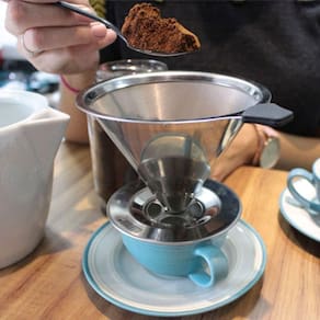 Coador De Café Bialetti Pour Over Em Aço Inox 10490406 Coador de Café Bialetti Pour Over em Aço Inox 10490406 Coador em aço inox 18/10 para preparo do café coado A passagem da água pelo pó de café de maneira uniforme resulta em uma bebida mais suave, com doçura e acidez acentuadas adequadamente A moagem do café deve ser média ou grossa e a quantidade ideal de pó é de 20/25 g para 400 ml de água, para 2 xícaras de café Coloque o Pour Over sobre a caneca ou xícara, coloque o café moído, despeje lentamente a água previamente fervida no café moído com movimentos circulares até que o café fique completamente submerso; espere até que toda a água tenha passado o Pour Over, este processo deve durar aproximadamente 3 minutos para melhores resultados
