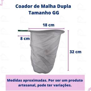 - coador reutilizável; - confeccionado em algodão 100%; - malha dupla; - haste e aro confeccionados em arame galvanizado; - comprimento do cabo: 8 centímetros padrão para todos os tamanhos - altura do coador: pp 13 cm , p 18 cm , m 22 cm , g 26 cm e gg 32 cm ; - largura do coador: pp 10 cm ; p 12 cm , m 14 cm , g 16 cm e gg 18 cm .