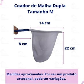 - coador reutilizável; - confeccionado em algodão 100%; - malha dupla; - haste e aro confeccionados em arame galvanizado; - comprimento do cabo: 8 centímetros padrão para todos os tamanhos - altura do coador: pp 13 cm , p 18 cm , m 22 cm , g 26 cm e gg 32 cm ; - largura do coador: pp 10 cm ; p 12 cm , m 14 cm , g 16 cm e gg 18 cm .