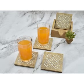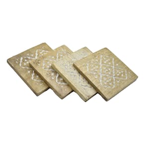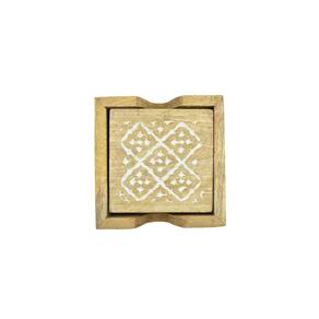 Armazene o conjunto Indya de 4 montanhas-russas quadradas de madeira com suporte para chá e café e bebidas para casa/cozinha/bar/escritório | Acabamento natural com escultura em flores