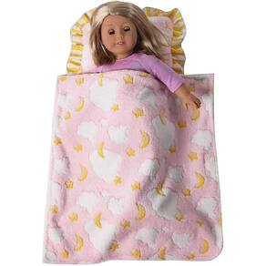 Dimensões: o cobertor mede aprox. 43,18 cm x 43,18 cm e o tamanho médio aprox. 20,32 cm x 28 cm. - Cobertor e travesseiro de boneca rosa nuvens - Dimensões: o cobertor mede aprox. 43 cm x 43 cm e mede aprox. 20 x 28 cm.