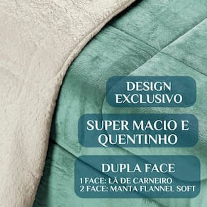 Composição: Face 1 coberta de Microfibra Soft Face 2 coberta de lã de Carneiro Enchimento manta 100% poliéster
