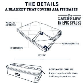 Cobertor multiuso YETI Lowlands O cobertor Lowlands ajuda a transformar todos os shows ao ar livre, porta traseira ou post-up no interior em seu acampamento base pessoal. Tudo, desde a camada de utilidade à prova d'água até o interior extremamente macio e isolado foi meticulosamente projetado para criar um cobertor único, todo-o-terreno e ultraconfortável. E o seu cão também vai adorar. É projetado para repelir sujeira, rebarbas e pelos de animais de estimação, então deixe-os sentar, deitar e rolar sobre ele o quanto quiserem. O cobertor tem 139,7 cm x 198,1 cm desdobrado.