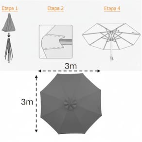 Instalação (ombrelones de haste central): de fácil Instalação, não necessita de ferramentas, basta remover a tampa plástica de acabamento do topo (rosqueável), sobrepor a Cobertura sobre a estrutura do ombrleone (preferencialmente fechado) e então começar a encaixar as postas da cobertura nas pontas das hastes, e por final, recolocar a tampa plástica do topo.