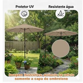 Instalação (ombrelones de haste central): de fácil Instalação, não necessita de ferramentas, basta remover a tampa plástica de acabamento do topo (rosqueável), sobrepor a Cobertura sobre a estrutura do ombrleone (preferencialmente fechado) e então começar a encaixar as postas da cobertura nas pontas das hastes, e por final, recolocar a tampa plástica do topo.