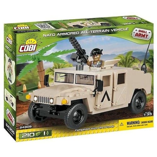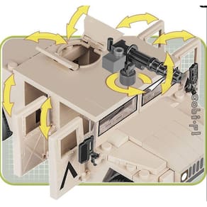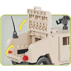 COBI Small Army - Nato Armored All-Terrain Vehicle - Humvee Desert 24305Um veículo moderno com rodas multiuso com mobilidade muito alta em camuflagem no deserto. É ideal para unidades de infantaria que precisam de um meio de transporte rápido para lidar com terrenos difíceis. Além de soldados, também pode transportar munições, suprimentos e até mesmo ser usado como ambulância móvel.O modelo tem muitas funcionalidades que definitivamente serão úteis durante o jogo. A alta suspensão do veículo e suas rodas sólidas e móveis permitirão atravessar os maiores vértices em blocos. O veículo tem quatro portas de passageiro abertas, um porta-malas de abertura larga, uma escotilha de abertura no teto e uma metralhadora pesada rotativa do tipo minigun. O conjunto inclui uma estatueta de soldado, uma caixa de munição com cartuchos de artilharia e mini elementos de cenário com uma palmeira e uma colina de areia.210 componentes de alta qualidade,fabricado na UE por uma empresa com mais de 20 anos de tradição,atender aos padrões de segurança para produtos infantis,totalmente