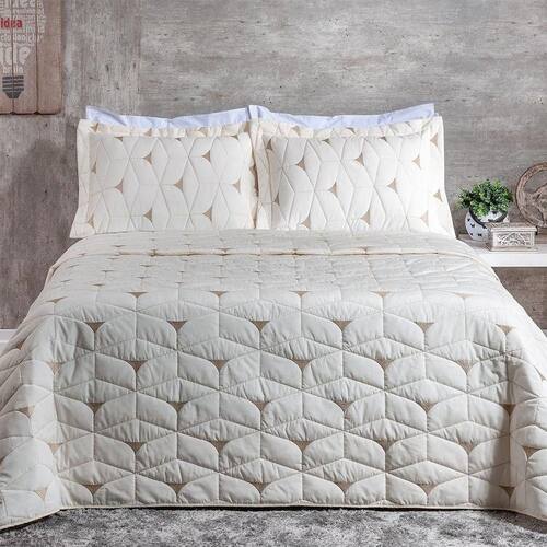 Design Moderno e Bordado: O cobre leito possui um delicado bordado geométrico que cria uma textura única e sofisticada, valorizando a decoração do ambiente.