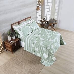 Versatilidade Dupla Face: Com um lado floral e outro geométrico, este cobre leito é dupla face, permitindo que você mude a decoração do quarto com um simples gesto, equilibrando ternura e modernidade.