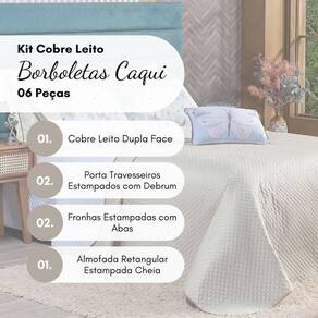Apresentando o Kit Cobre Leito Borboletas Caqui em Dupla Face com Almofada, perfeito para adicionar um toque de elegância e conforto ao seu quarto. Este conjunto inclui seis peças cuidadosamente selecionadas para transformar o ambiente do seu dormitório. A estampa de borboletas em cores de tons suaves oferece um visual encantador, enquanto a versatilidade da face dupla permite que você alterne entre os estilos conforme sua preferência. O kit é composto por um cobre leito acolchoado, dois porta-travesseiros estampados com debrum, duas fronhas decorativas com abas laterais e uma almofada retangular estampada elegante, proporcionando um conjunto completo de elementos coordenados para a sua cama. Combinando estilo e funcionalidade, este kit adiciona um toque de sofisticação e conforto ao seu espaço de descanso. Confira!