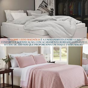 Imagine chegar ao final de um dia cansativo e se deitar em uma cama que parece um abraço suave... Esse é o efeito do Cobre Leito Magnólia. Com toque macio, caimento impecável e acabamento de luxo, ele não é apenas um cobre leito: é a peça que transforma o seu quarto em um refúgio de aconchego e elegância. Cada detalhe transmite cuidado, trazendo beleza e conforto para sua rotina.