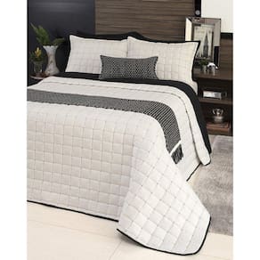Cobre Leito Casal King 5 peças 01 Cobre Leito Dupla Face 2,60m comprimento x 2,80m largura 02 Porta Travesseiros matelados com abas 75cm x 55cm 01 Almofada Tear com enchimento 60cm x 30cm 01 Peseira de Tear 2,25m comprimento x 45m largura