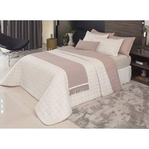 Nossa loja vem para trazer o que há de melhor em produtos para sua roupa de cama, mesa e banho, sempre preocupada em levar a maior qualidade de produtos e atendimento até você, nosso cliente e amigo. Cobre Leito Casal Queen 5 peças 01 Cobre Leito Dupla Face 2,40m comprimento x 2,60m largura 02 Porta Travesseiros matelados com abas 75cm x 55cm 01 Almofada Tear com enchimento 60cm x 30cm 01 Peseira de Tear 2,10m comprimento x 45m largura Composição: Tecido Face 1 e 2 : Percal de Poliéster 100%. Almofada e Peseira: Tear 100% algodão.