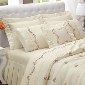 Sendo: 01 Cobre leito Bordado 2,60m x 2,40m 02 Porta-travesseiros detalhe em lase 75cm x 55cm 01 Capa de almofada Bordado Floral e detalhe em lase 45cm x 45cm 01 Refil de almofada 40cm x 40cm 01 Rolo com bordado floral e detalhe em lase tamanho irregular
