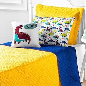Cobre Leito Solteiro 5 Peças Amarelo/Marinho Coleção Dino O mundo dos dinossauros invade o quarto dos meninos A nossa coleção Dino é confeccionada em tecido 100% poliéster, sendo dupla face - o que permite ser dos dois lados e assim ter duas versões com o mesmo produto - e matelassado com a tecnologia ultrassônica. O porta travesseiro e a almofada são impressas com a tecnologia digital, garantido assim uma alta definição da estampa. CONTEÚDO DA EMBALAGEM - 01 Cobre Leito - 2,50 m x 1,80 m - 01 Porta Travesseiro - 65 cm x 45 cm - 01 Fronha estampada - 65 xm x 45 cm - 01 Capa de almofada - 40 cm x 40 cm - 01 Refil de almofada - 40 cm x 40 cm COMPOSIÇÃO - Tecido 100% Poliéster - Enchimento: 100% Poliéster FICHA TÉCNICA - Quantidade de peças: 05 - Cor: Amarelo/Marinho - Bordado: Não - Fabricação: Matelado Ultrassônico - Fronha e almofada com estampas digitalizadas ORIENTAÇÕES PARA LAVAGEM - Processo de lavagem suave; - Lavar com temperatura máxima de 40C; - Não deixar o produto de molho, pois roupas de cama de cor forte podem desbotar; - Utilizar sabão neutro; - Evite sabão do tipo limpeza profunda e/ou tira manchas; - Não alvejar / não branquear; - Não secar em secador rotativo não utilizar secadora ; - Não lavar a seco; - Passar com temperatura baixa temperatura máxima de 110C ; - Vapor pode causar danos irreversíveis. ATENÇÃO - Verificar as dimensões do produto antes da compra. - É necessário levar em consideração a altura da cama ou a altura do box da cama + colchão, para que o caimento do produto seja perfeito. - Siga as orientações para lavagem para aumentar a vida útil das peças - Variação das cores pode ocorrer de acordo com a configuração do monitor. - As peças decorativas não estão inclusas neste produto. - Variação da tonalidade do tecido pode ocorrer de acordo com o lote da matéria prima; - Foto ilustrativa. Marca: Não Informado