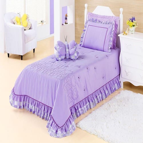 A Linha Jardine é encantadora e delicada com detalhes em bordados e babados no cobre leito e no porta travesseiro. Confeccionado em tecido superior e inferior em 100% poliéster e enchimento em 100% poliéster.Composição: 01 Cobre leito 2,40m x 1,70m 01 Porta travesseiro 65cm x 45cm 01 Almofada borboleta 48cm x 35cmGênero - Menina