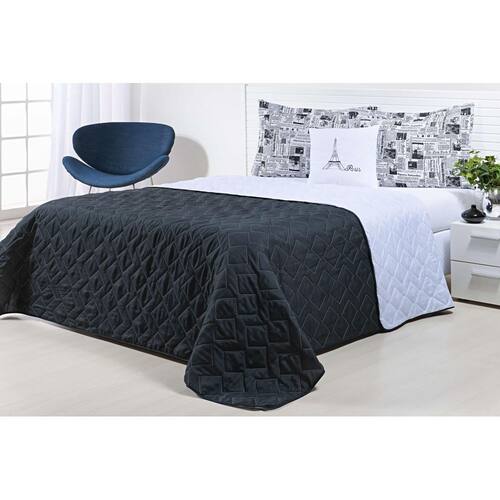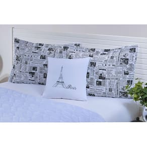 Cobre leito viuva 5 peças microfibra dupla face jornal paris Thais enxovais Cobre leito de viuva 5 peças microfibra dupla face paris 1 cobre leito dupla face paris 2,05m x 2,30m com vies na volta inteira 2 porta travesseiro matelado 0,70cm x 0,50cm 01 almofada com detalhe bordado 0,45 x 0,45 01 enchimento de almofada flocos de espuma Cor cobre leito 1 lado preto e 1 lado branco ,podendo ser Utilizado dois lados. Não acompanha os enchimento dos travesseiros . Composiçao Tecido microfibra 100% polieste enchimento 100%poliester Marca: Thais Enxovais Ean: 7895130400201