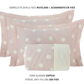 Complemente a decoração do seu quarto com o Cobreleito Poá Ives 200 Fios, da linha Vintage Kacyumara. O padrão delicado de poá em rose sobre um fundo claro proporciona uma sofisticação sutil ao ambiente. Além de ser visualmente atraente, o cobreleito Poá Ives é confeccionado em 100% algodão, com 200 fios, garantindo maciez e durabilidade, ideal para todas as estações. Seja para os dias mais quentes ou para usar como complemento de aquecimento nos dias mais frios, o Cobreleito Poá Ives se adapta perfeitamente a qualquer ocasião, oferecendo conforto e elegância à sua cama. Complete o visual da sua cama com o Cobreleito Poá Ives 200 Fios e transforme seu quarto em um espaço aconchegante e sofisticado. Garanta o seu agora mesmo