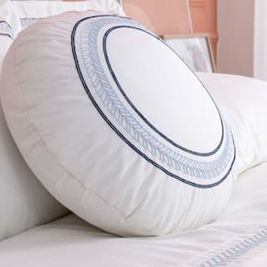 Desfrute de uma cama fofinha, elegante e completa, acompanhada de porta travesseiros bordados e uma charmosa almofadinha redonda.