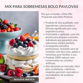 Cocook - sobremesa mix preparados bolo pavlova avelã A pavlova, uma sobremesa que encanta paladares e gera debates uma iguaria de merengue crocante por fora e macio por dentro, coberta com chantilly e frutas frescas. Sua origem é um mistério saboroso, disputado entre a austrália e a nova zelândia. O que sabemos com certeza é que essa delícia foi criada em homenagem à bailarina russa anna pavlova, que inspirou sua leveza e graciosidade. Independentemente de sua origem, a pavlova é um símbolo da culinária da oceania, perfeita para celebrar momentos especiais. O preparado para pavlova é a sua porta de entrada para uma sobremesa dos sonhos se você está pensando em surpreender seus convidados com um clássico da confeitaria, nada melhor do que preparar o famoso bolo anna pavlova. Com o nosso mix, você vai sentir que está nas nuvens esse preparado incrível foi pensado para te ajudar a criar uma sobremesa crocante e deliciosa. Tudo que você precisa é de clara de ovos, um forno elétrico e uma batedeira potente semi- . A magia acontece quando você segue o passo a passo: use todos os envelopes na ordem numerada e, ao final, asse nas 8 formas de papel que acompanham o mix. Depois de assar, é hora da parte mais divertida: decoração capriche no chantilly e nas frutas para dar aquele toque especial que vai deixar todo mundo com água na boca cada embalagem contém a quantidade ideal para você fazer essa delícia em casa e se tornar o chef da sobremesa perfeita. Não perca a chance de brilhar na cozinha e fazer sucesso entre amigos e família experimente o preparado para pavlova e leve suas habilidades culinárias a um novo nível Facilidade de preparo: com nosso mix, preparar essa sobremesa clássica nunca foi tão simples. Em poucos passos, você terá uma pavlova leve, crocante por fora e macia por dentro, pronta para ser decorada com frutas frescas, chantilly ou o que sua imaginação desejar. Versatilidade: a pavlova serve como base para uma infinidade de criações. Você pode personalizá-la com diversos toppings, como frutas frescas, cremes ou chocolates, adaptando-a a diferentes gostos e ocasiões. Apelo visual: além do sabor delicado, a pavlova possui uma apresentação elegante e sofisticada, tornando-se o destaque de qualquer mesa de sobremesas. Porção generosa: cada embalagem rende 10 unidades de pavlova, ideal para compartilhar em eventos, reuniões familiares ou simplesmente para apreciar ao longo da semana. Informações nutricionais porções por embalagem: 10 Porção: 50 g fração por 100 g 50 g, %vd : valor energético 355 kcal 178 kcal, 9% Carboidratos 53 g 27 g, 9% , dos quais açúcares totais 41 g 20 g , açúcares adicionados 40 g 20 g, 40% Proteínas 4,1 g 2 g, 4% Gorduras totais 15 g 7,7 g, 12% , das quais gorduras saturadas 5,2 g 2,6 g, 13% , gorduras trans 0 g 0 g, 0% Fibras alimentares 3 g 1,5 g, 6% Sódio 20 mg 9,8 mg, 0% . O que tem na embalagem No nosso kit tem tudo o que você precisa para arrasar na cozinha: Mistura para pavlova Saco de confeitar com bico de inox Forminhas e papel cortado no tamanho certo Manual de instruções detalhado Com o nosso kit, você vai se sentir um verdadeiro chef pâtissier, surpreendendo a todos com essa sobremesa sofisticada e deliciosa. Medida: 18cm x 9cm x 14cm Peso: 500 gramas