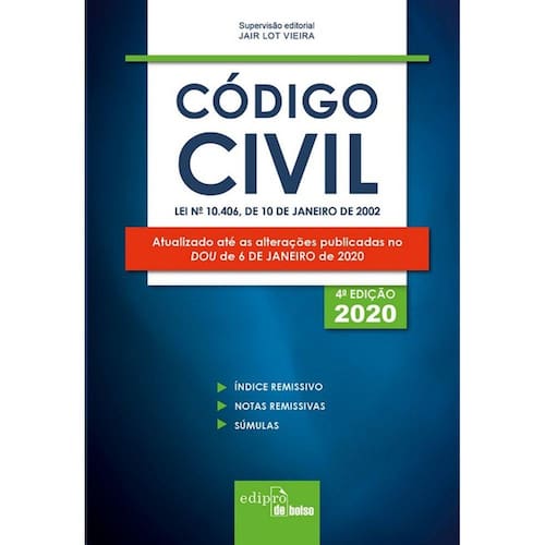 Lei n 10.406, de 10 de janeiro de 2002. Atualizado até a Lei n 13.874, de 20 de setembro de 2019, e o DOU de 6 de janeiro de 2020. Inclui: Lei de Introdução às Normas do Direito Brasileiro e Regulamento; ADIN n 4.815; Enunciados do Conselho da Justiça Federal; Temas Representativos da Corregedoria da Justiça Federal; Súmulas e Súmulas Vinculantes do STF; Temas com Repercussão Geral do STF; Súmulas do STJ; Temas Repetitivos do STJ; Índice remissivo; Notas remissivas.