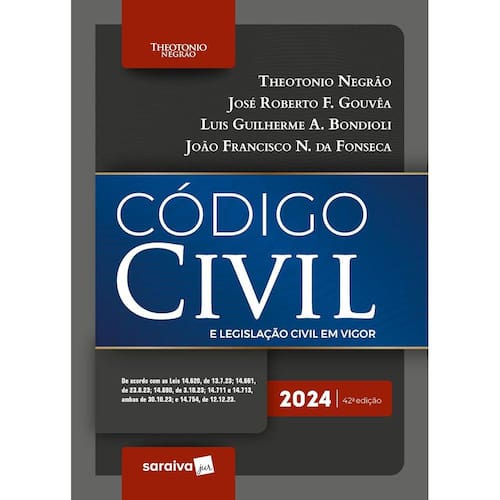 CÓDIGO CIVIL E LEGISLAÇÃO CIVIL EM VIGOR, mantendo a essência de uma obra que se destaca pelos minuciosos comentários artigo por artigo, as principais decisões de Tribunais e referências a outros artigos e leis. Trata se de obra imprescindível aos profissionais do Direito e também aos estudantes que ingressam ao estágio em Direito e que necessitam de informações seguras e precisas a respeito de todo o universo do Direito Civil. A presente 42ª edição está de atualizada de acordo com as Leis 14.620, de 13-7-23; 14.661, de 23-8-23; 14.690, de 3-10-23; 14.711 e 14.713, ambas de 30-10-23; e 14.754, de 12-12-23. Data de fechamento da edição: 18-1-2024.