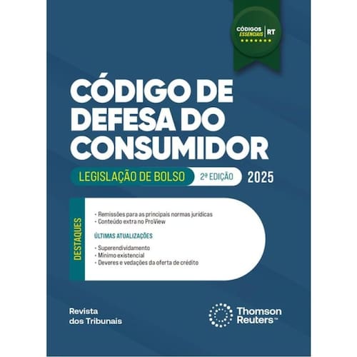 Códigos Essenciais RT - 2025 Conteúdo confiável RT em formato de bolso. Legislação atualizada e com muitas notas remissivas, como só a RT sabe fazer, agora em formato de bolso. Um código leve e fácil de carregar, mas cheio de remissões úteis e com fonte confortável à leitura. Um novo formato, com a praticidade que o seu aluno precisa para complementar os estudos. Além disso, o seu Código vem com um índice remissivo completo e atualizado no ProView. • Indicado para a 2ª Fase do Exame da OAB; • Inclui remissões legislativas que facilitam e complementam os estudos; • Conteúdo extra em ProView • Conteúdo atualizado Destaques Códigos Essenciais RT – Código de Defesa do Consumidor • Remissões para as principais normas jurídicas • Conteúdo extra no ProView • Superendividamento • Mínimo existencial • Deveres e vedações da oferta de crédito