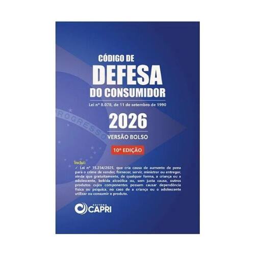 A fim de atender ao público interessado em levar o seu manual do Código de Defesa do Consumidor (Lei nº 8.078) para qualquer lugar ou respeitar o layout de sua loja, a Editora Capri lança a versão atualizada de bolso. Inclui a Lei N: 15.234/2025, que cria causa de aumento de pena para o crime de vender, fornecer, servir, ministrar ou entregar, ainda que gratuitamente, de qualquer forma, a criança ou a adolescente, bebida alcoólica ou, sem justa causa, outros produtos cujos componentese possam causar dependência física ou psíquica, no caso de a criança ou o adolescente utilizar ou consumir o produto. Marca: Não Informado