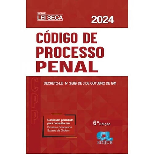 CÓDIGO DO PROCESSO PENAL – Série Lei Seca - 280 págs - (íntegra do texto) JÁ ATUALIZADO COM A LEI 14.752 DE 12/12/2023 Tamanho: 12 x 18 cm DESCRIÇÃO INTERNA: - Artigos em destaque no cabeçalho - Fonte em tamanho padrão de livro - Possui folhas especiais para não transferir marcações NOVIDADE: ÍNDICE REMISSIVO POR ASSUNTO Fechamento da Edição Atualizado até 26/01/2024 Conteúdo permitido para consultas em: - Provas - Concursos - Exame da Ordem