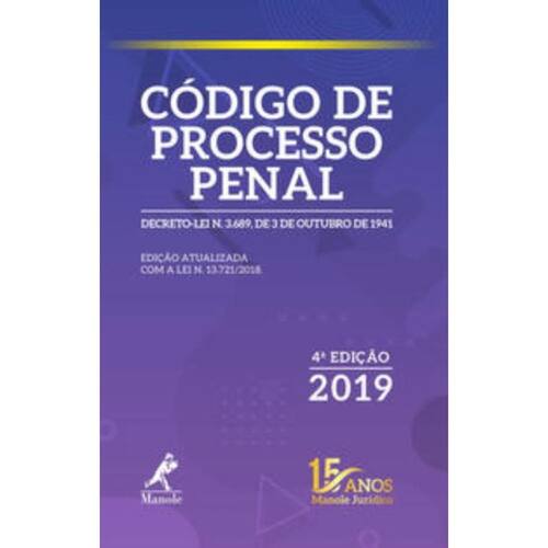 A EDITORA MANOLE, prosseguindo com suas publicações jurídicas, apresenta agora seu volume contendo exclusivamente o Código de Processo Penal (Decreto-lei n. 3.689, de 03.10.1941), devidamente atualizado de acordo com a s Lei s n s . 13.721/2018 e 13.7699/2018. Esta edição está atualizada até o dia 03.01.2019, e o leitor poderá manter- -se informado sobre as mudanças na legislação no site manoleeducacao.