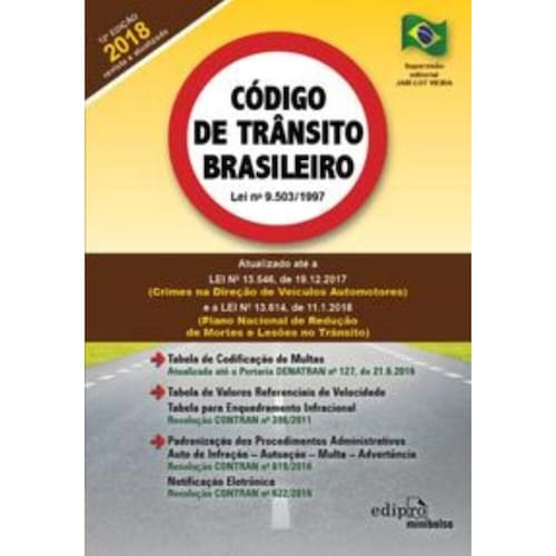 Código de Trânsito Brasileiro, Lei nº 9.503/1997, atualizado até o DOU de 11.6.2018, com a LEI nº 13.546, de 19.12.2017 (Crimes na Direção de Veículos Automotores) e a LEI nº 13.614, de 11.1.2018 (Plano Nacional de Redução de Mortes e Lesões no Trânsito). Inclui: Tabela de Codificação de Multas Atualizada até a Portaria Denatran nº 127/2016; Tabela de Valores Referenciais de Velocidade e Tabela para Enquadramento Infracional (Resolução CONTRAN nº 396/2011); Padronização dos Procedimentos Administrativos Auto de infração, Autuação, Multa, Advertência (Resolução CONTRAN nº 619/2016); e Notificação Eletrônica (Resolução CONTRAN nº 622/2016).