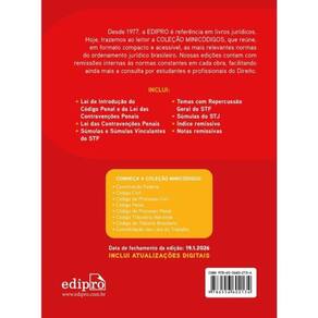 Desde 1977, a EDIPRO é referência em livros jurídicos. Hoje, trazemos ao leitor a COLEÇÃO MINICÓDIGOS, que reúne, em formato compacto e acessível, as mais relevantes normas do ordenamento jurídico brasileiro. Nossas edições contam com remissões internas às normas constantes em cada obra, facilitando ainda mais a consulta por estudantes e profissionais do Direito. INCLUI: Lei de Introdução do Código Penal e da Lei das Contravenções Penais; Lei das Contravenções Penais; Súmulas e Súmulas Vinculantes do STF; Temas com Repercussão Geral do STF; Súmulas do STJ; Índice remissivo; Notas remissivas. INCLUI ATUALIZAÇÕES DIGITAIS DATA DE FECHAMENTO DA EDIÇÃO: 19.1.2026 CONHEÇA A COLEÇÃO MINICÓDIGOS: Constituição Federal; Código Civil; Código de Processo Civil; Código Penal; Código de Processo Penal; Código de Trânsito Brasileiro; Código Tributário Nacional; Consolidação das Leis do Trabalho.