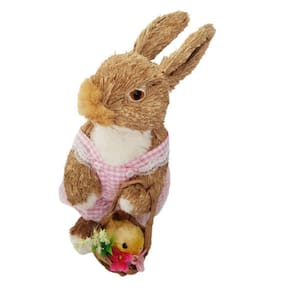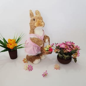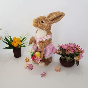 Coelha 37cm de altura, confeccionada em EPS e revestida com palha natural. O ;vestido xadrez rosa com renda branca, o peito e pés em pelúcia branca e a cesta em palha natural com pintinho amarelo e mini flores são detalhes que dão um charme a parte que a deixa mais fofa e charmosa. Confeccionada com materiais PREMIUM e acabamento finíssimo, linda, perfeita! Ideal para usar sobre aparador, balcão, hall de entrada, mesa de escritório, vitrines de comércio ou onde sua imaginação te levar!