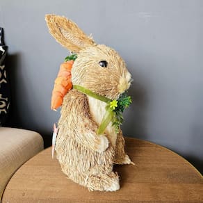 Transforme sua decoração de Páscoa com o Coelho de Páscoa de Palha com Cenoura de Lâmina de Madeira. Adquira já essa peça única para tornar sua celebração ainda mais especial Compre agora e leve a alegria da Páscoa para sua casa