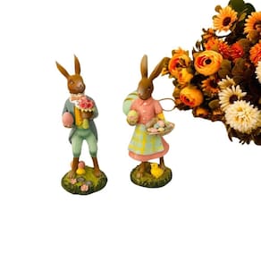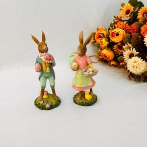 Material: ;Resina;Peso: 148grCores Predominantes: Azul, Rosa, Amarelo, Verde e Pele;CONTEÚDO DA EMBALAGEM: 1 CASAL DE COELHOS COM 13cm DE ALTURA.