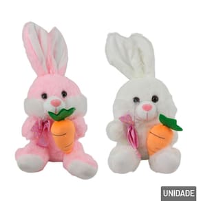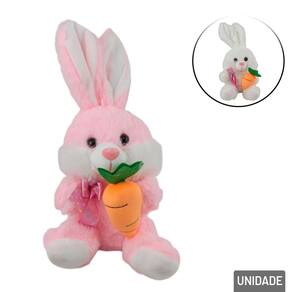 Coelho de Pelúcia Páscoa 27cm Sentado com C Com uma postura encantadora sentada, esse coelhinho traz um olhar meigo e um sorriso doce, ideal para enfeitar qualquer ambiente ou ser o companheiro de abraços das crianças. Para deixar a brincadeira ainda mais temática, o coelho segura uma cenoura de pelúcia, remetendo ao seu alimento favorito e trazendo ainda mais charme ao brinquedo.\nO detalhe do laço elegante no pescoço dá um toque especial e sofisticado, tornando o coelhinho ainda mais encantador. Feito com materiais de alta qualidade, o coelho possui um toque extremamente suave, perfeito para abraços e momentos de carinho. Compacto e fácil de transportar, é perfeito para acompanhar as crianças em qualquer lugar ou para compor uma linda decoração de Páscoa.\nSeja para surpreender alguém especial, decorar cestas de Páscoa ou compor um cantinho aconchegante, esse coelhinho é uma escolha inesquecível. Ideal para enfeitar festas de Páscoa, mesas decorativas e até mesmo o quarto das crianças, trazendo um toque de doçura e alegria.\nDisponível em cores diversas.\nEspecificações:\nMarca : TINGS\nTipo de material : Poliéster\nCores ou Estampa : Color\nDimensões do Produto : 27 X 15 X 12,5 CM\nDimensões da Embalagem : 27 X 15 X 12,5 CM\nPeso Bruto (Gramas) : 0.116 Marca: Não Informado