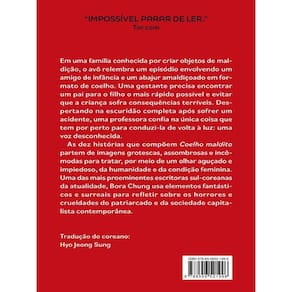 Os contos presentes em Coelho maldito, livro finalista do International Booker Prize, transitam entre realismo mágico, folclore, horror, ficção científica e fantasia, partindo de elementos insólitos para narrar histórias assombrosas que tocam em temas profundamente reais. A coletânea é a primeira obra de Bora Chung, uma das mais notáveis escritoras sul-coreanas da atualidade, publicada fora da Coreia. Em uma família cujos negócios consistem em criar objetos de maldição, o avô relembra um episódio envolvendo um amigo de infância e um abajur amaldiçoado em formato de coelho. Uma gestante precisa encontrar um pai para o filho o mais rápido possível, e evitar que a criança sofra consequências terríveis. Despertando no completo escuro após sofrer um acidente, uma professora confia na única coisa que tem por perto para levá-la de volta à luz: uma voz desconhecida. As dez histórias que compõem Coelho maldito partem de imagens grotescas, assombrosas e incômodas para tratar, por meio de um olhar aguçado e impiedoso, da humanidade e da condição feminina. Uma das mais proeminentes escritoras sul-coreanas da atualidade, Bora Chung usa elementos fantásticos e surreais para refletir sobre os horrores e crueldades do patriarcado e da sociedade capitalista contemporânea. “Com a linguagem concisa e eficaz de Chung, é impossível parar de ler.” — Tor. com