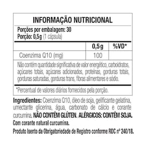 Ingredientes Coenzima Q10, óleo de soja, gelificante gelatina, umectante glicerina, água, carbonato de cálcio e corante curcumina. NÃO CONTÉM GLÚTEN. ALÉRGICOS: CONTÉM SOJA. Com corante natural curcumina.