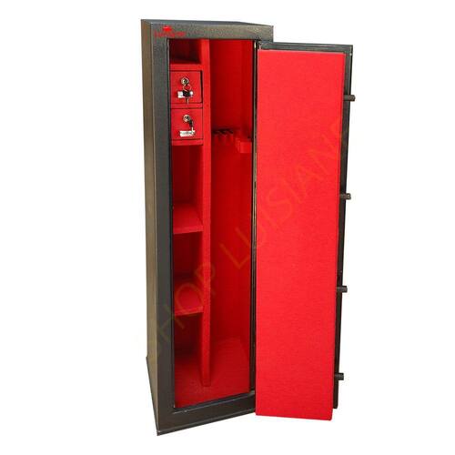 Segredo mecânico de 03 combinações e fechadura tipo tetra; Estrutura do cofre: Corpo fabricado em chapa de 1mm e porta em chapa 2mm. Porta com 04 travas maciças de 18mm de diâmetro. Pintura em esmalte sintético. Gavetas com fechaduras. O cofre já vai com 04 furos na parte de trás para fixação na parede.