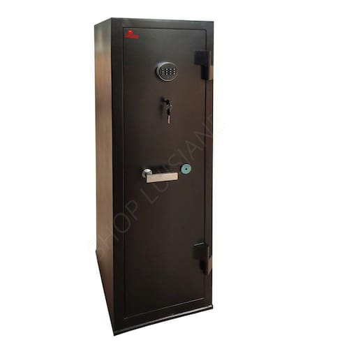 Estrutura do cofre: Corpo fabricado em chapa de 1,2mm e porta em chapa 2mm. Porta com 04 travas maciças de 18mm de diâmetro. Pintura em esmalte sintético. Gavetas com fechaduras. O cofre já vai com 04 furos na parte de trás para fixação na parede.