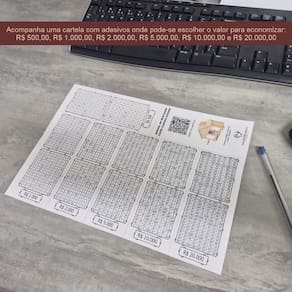 Acompanha cartelas adesivas com o desafio de diversos valores, onde você escolhe o quanto quer poupar